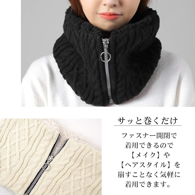 ファスナー付きネックウォーマーだから頭からかぶる事もなく髪形やメイク崩れを気にしないで済む楽ちんさがとても魅力