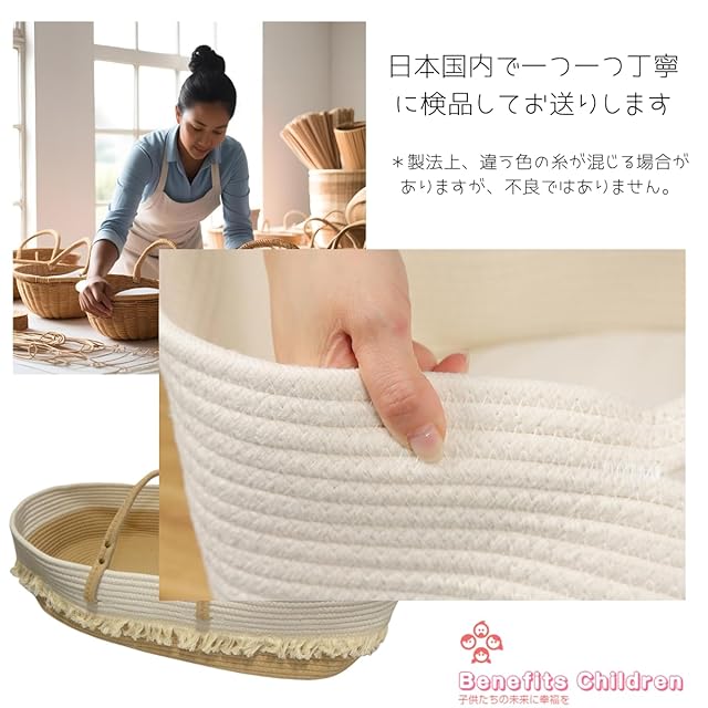 【安全と品質】日本国内で一つ一つ検品して、更に有害物質の検査をしており、赤ちゃんの健康を第一に考えています。ロープ編みの特性を理解し、自然な風合いを楽しんでいただけます。ただし、長時間の就寝には適していないため、ご注意ください。