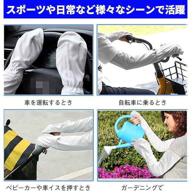【ひんやり冷感素材】 アームカバーは涼しい冷感布地を採用して、夏場に少しでも快適に過ごせるよう設計されひんやり冷感アームカバーです。水や汗で濡れると気化熱の作用により冷却効果があり、肌と接触した瞬間に温度が下がり、ヒンヤリとした冷感が続き、ひんやりとした使用心地が夏用にぴったりです。 【メシュで通気性が優れる】 蒸れずに快適なメッシュ加工をしています。通気性のいい爽やかな着け心地を実現しています。長時間着用しても、締め付け感なくて変形しにくいです。