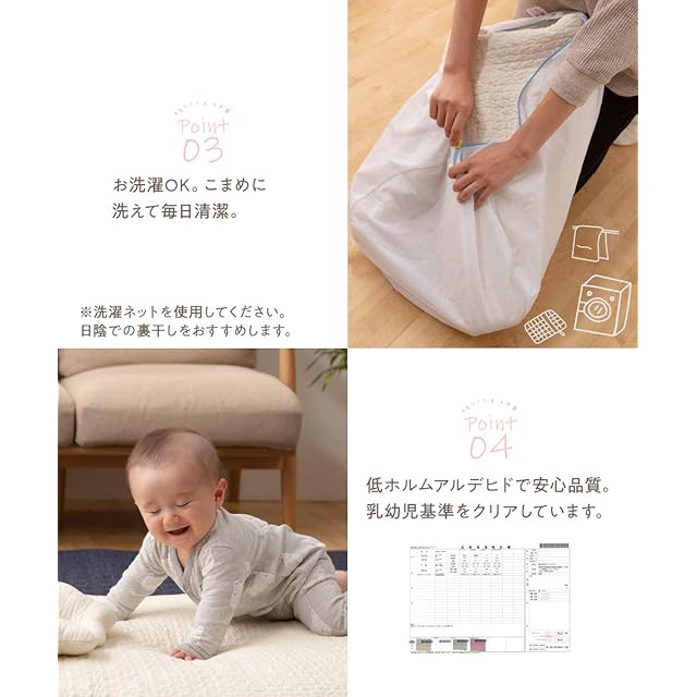 【特長】お肌にやさしく、吸水・吸湿力に優れた綿100%なのでムレにくいのも特徴。厚生労働省の定める乳幼児基準をクリアした低ホルムアルデヒド製品で、安心品質です。