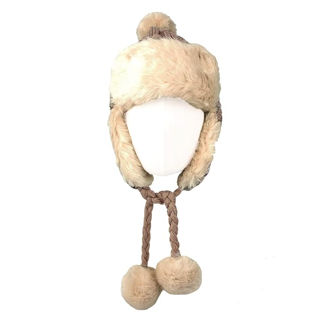 イヤーフラップ&ポンポンが付いたかわいいニット帽です。/裏地:フェイクファー