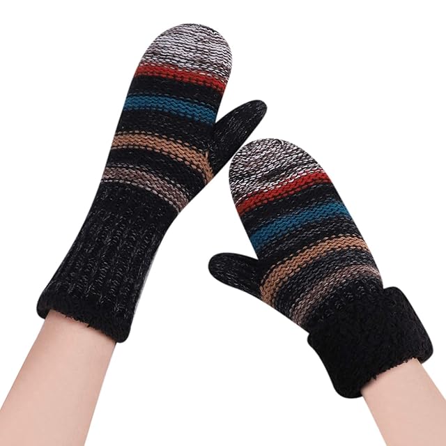 [LONTG] レディース手袋 ニットグローブ ストライプ 多色毛糸編み ミトン手袋 裏ボア付き 厚手 あったか 冬用防寒グローブ アウトドアグローブ 女性 通勤 通学 自転車 バイク 寒さ対策 カジュアル おしゃれ ゴーディ アクセサリー プレゼント ブラック