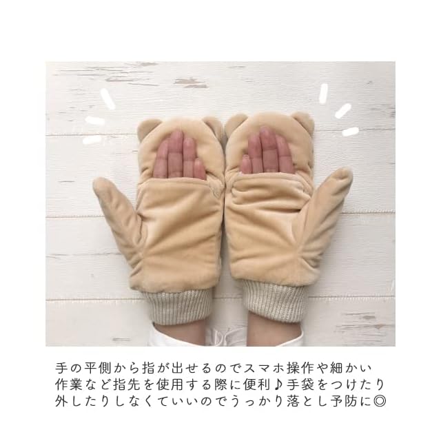 表面は柔らかくなめらかなベロア生地、 内側はボア素材で暖かいミトンタイプの手袋。 手のひら側から指が出せるので、スマホなど 指先を使用する際にとても便利です。 手袋を付けたり外したりをしなくて済むので、 「うっかり落としてしまった!」問題も解消☆