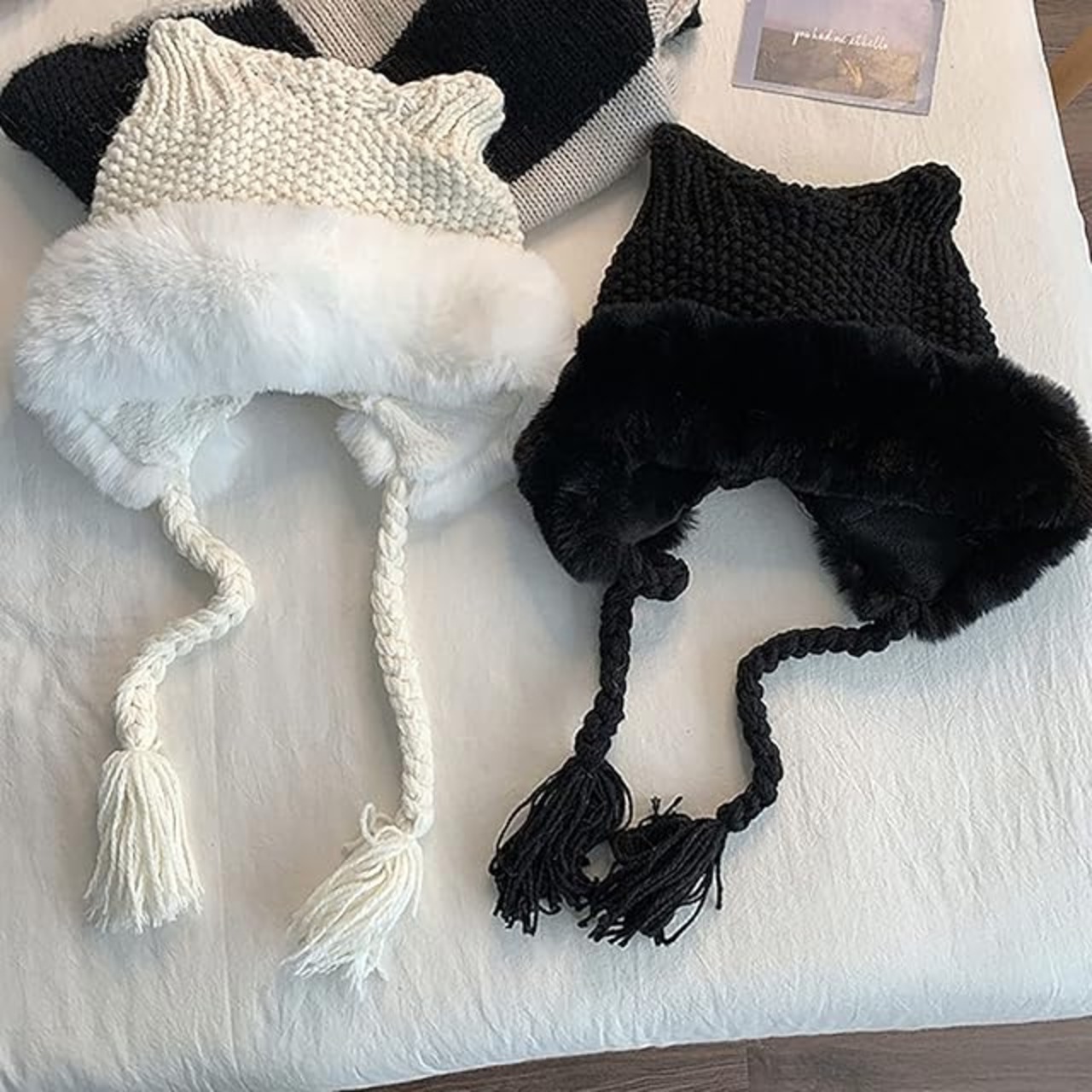 [ELVONS] 猫耳ニット帽 レディース ビーニーハット猫耳 キャップ かわいい帽子 秋冬 あったか小顔効果 伸縮性 暖かい帽子 防寒帽 裏起毛 かわいい 耳付き帽子 ニットキャップ シンプル おしゃれ アウトドア カジュアル クリスマス ギフト プレゼント (ブラック)