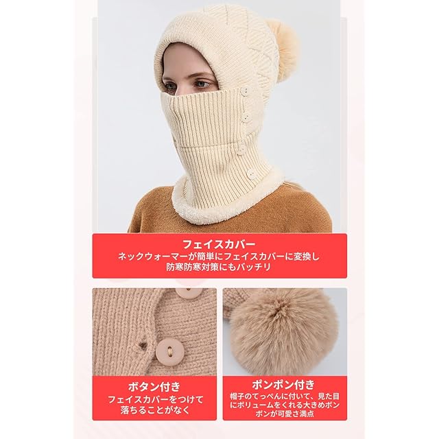 [LeafIn] 2Way&暖かい裏起毛 ニット帽子 レディース ネックウォーマー ネックフェイスカバー ビーニー ニットキャップ ポンポン 厚手 裏起毛 ボア 防寒防風 スノーボード スキー 防寒具 自転車 バイク 釣り 登山 通勤 通学 冬 9888(B-ベージュ) | AVENIR