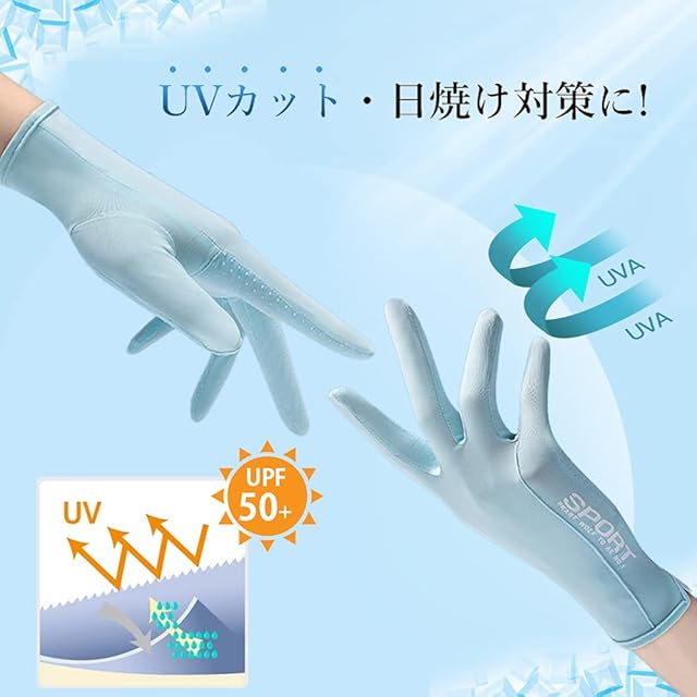 【夏にうれしい冷感素材】冷感素材を採用して、水や汗で濡れると気化熱の作用により冷却効果があり、タッチすると涼しい感じがします。春夏にピッタリのUVカット手袋です。 吸湿性、放湿性も優れているので、蒸れなくサラサラとしたつけ心地で夏でも快適ご使用いただけます。