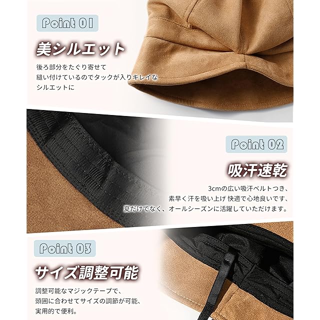 【サイズ調整可能・小顔効果抜群】頭周り:約53〜58cm。つば約6.5cm、小顔効果もばつぐん。帽子の内側にアジャスター(マジックテープ)がついているので、サイズの微調整が可能です。帽子のトップは八角形のピークで作られており、フィット感よく着用でき、立体的な形状をしているので、頭の形が綺麗に見えるようで、小顔効果も抜群!秋冬の地味目なお洋服のポイントにもなり、さり気なくおしゃれ度を引き上げて、 深くもかぶれるのでお出かけにも便利。
