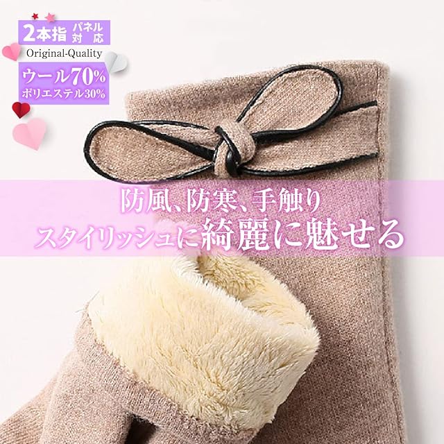 ?【素材】厳選された高品質なウールを使用、保温性も高く、柔らかい素材は手にピッタリフィットします。裏側には保温性に優れた裏起毛を採用、風を通さず熱を逃がしません。また毛玉にもなりにくい素材となっております。優しく手洗いをして頂けますと、風合いを損なわずに長くお使い頂けると思います。 ?【サイズ】 フリ—サイズ 全長22.5㎝ 中指長さ9cm 手回り20㎝(親指したから計測) ?【スマホ対応】親指と人差し指に導電性素材繊維対応、あらゆるタッチパネルに対応可能です。タッチパネル部分は、可愛いハート型。寒い時に手袋を外さずスマホ、駅の券売機、カーナビ操作ができるので、大変便利です。 ?【拘りのデザイン】年代問わずに着用できる飽きのこないデザイン、派手過ぎず控えめ、でもオシャレには拘りたい!そんなあなたの為にコーディネートしやすいカラ−バリエーションにしました。大人可愛い女性を演出してくれるマストアイテム、今韓国で大流行のリボンにも注目 ?【プレゼント】お友達、ご家族、お世話になった方、先輩へのプレゼント、bクリスマス、誕生日、記念日、b彼女への贈り物として。20代から80代までの女性に喜んで頂ける一品です。一品一品検品をしておりますが、万が一不良品がございましたら、当社まで遠慮なくご連絡下さいませ。返品対応させて頂きます。