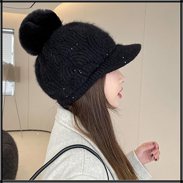 ニット帽デザインにボンボンとツバの両方ついたデザインが特徴的な レディース カジュアル デザイン ニット帽。