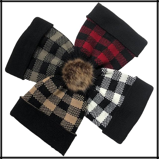 チェック柄のデザインにブラウンのボンボンがかわいい レディース カジュアル デザイン ニット帽。