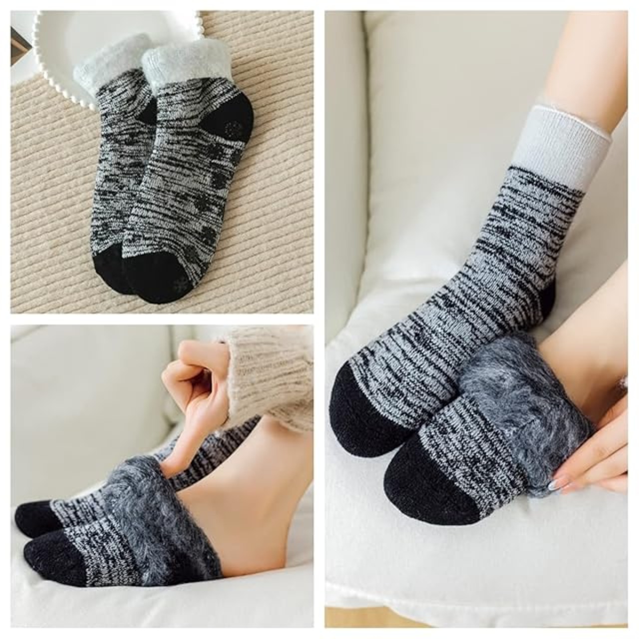 4.表地はコットン素材、裏地はモコモコの断熱繊維でやわらかく非常に暖かい履き心地のルームソックス。足先から足首まで、たっぷり裏起毛に仕上げた。熱を内側に閉じ込め、空気の層ができることで保温力を高めます。寒い中でアウトドアに長時間いる時もこれがあれば安心。履き口部分は、締めつけ感のないらくらくフィットのゆったりロゴム仕樣です。足底にびっしり滑り止めが付いているので、フローリングの室内でも滑りにくい仕様です。折り返して履いていった後にふわふわの裏起毛が露出されます。暖かっぽくも可愛らしくもコーディネートが楽しめます!様々雑誌でも掲載されて、今年も大人気!