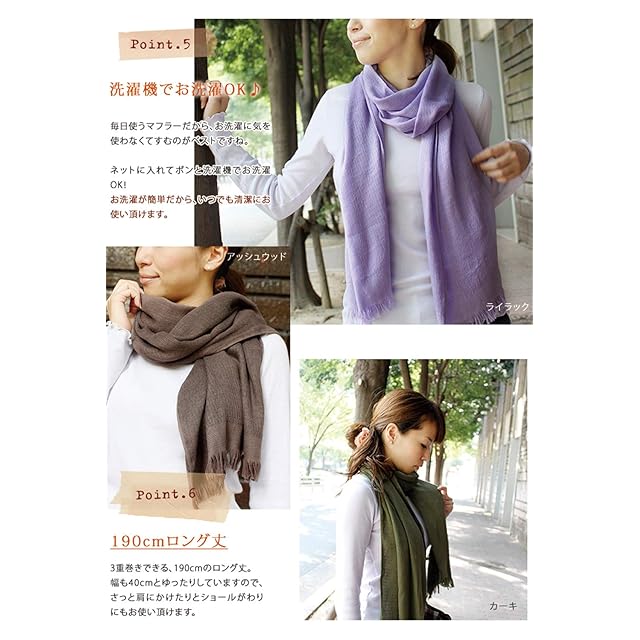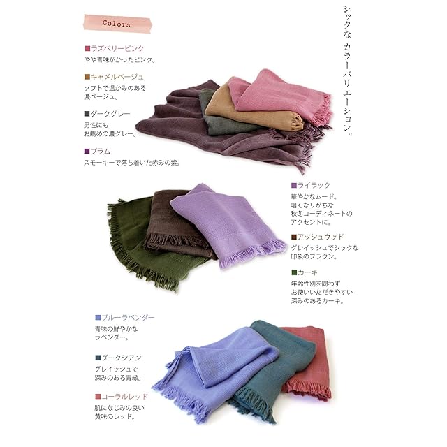 【マフラー】生産地:日本製 サイズ:約40cm×190cm カラー:プラム、ラズベリーピンク、ダークグレー、キャメルベージュ、ライラック、カーキ、アッシュウッド、ブルーラベンダー、ダークシアン、コーラルレッド お届け内容:マフラー 単品(1枚)