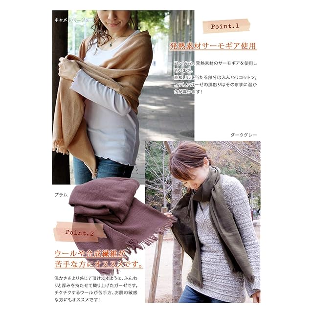 【「サーモギア(旭化成)」を使用】<サーモギア>は、<ベンベルグ>とマイクロ抗ピルアクリルを組み合わせた、ソフトな感触の吸湿発熱繊維。吸湿発熱性、調湿機能に優れています。コットンガーゼの肌触りはそのままに、温かさが違います。