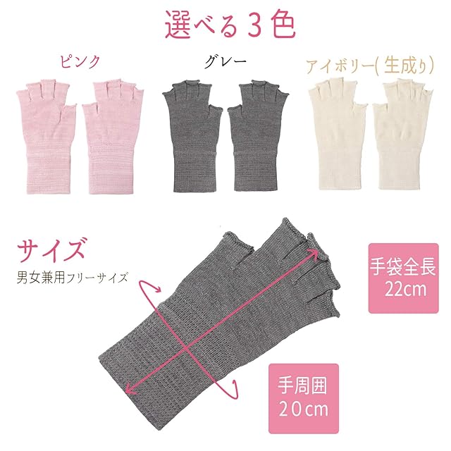 締め付けないから24時間着用できる。(昼間:ハンドウォーマー、夜間:おやすみ手袋として)「美肌シルク」でお肌つるつる。「潤いアロエ」で手肌しっとり。沖縄アロエベラ保湿成分を配合した新繊維「moist」配合。配合率:シルク45%、アロエ繊維(moist)55%。