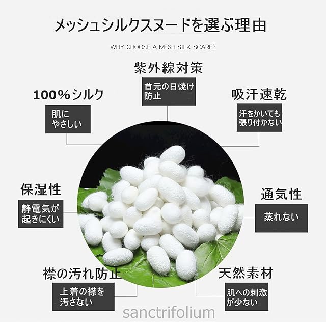 シルク100%のネック カバーです。メッシュシルクのため、通気性、伸縮性に優れ、肌触りも柔らかです。スカーフと違い結ぶ必要はありません。被るだけで簡単に着用できます。