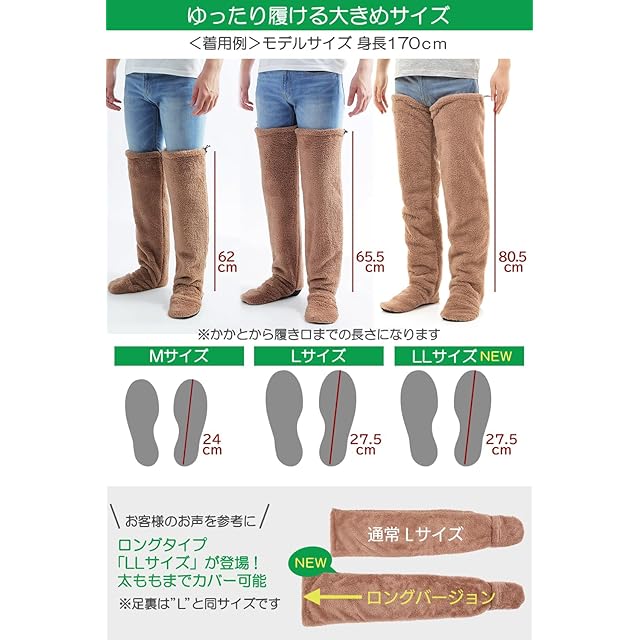 【男女兼用】通常のMサイズに加え、Lサイズをご用意。男性もゆったり履いていただけます。Lのロングバージョンが新登場!太ももまでのロング丈なのでしっかり暖かい。サイズ M 22~ 25cm、L 26~29cm、LL 26~29cm