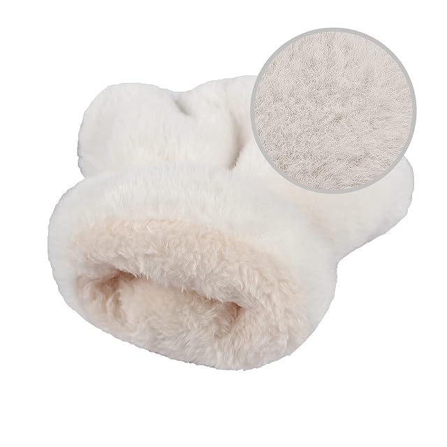 二層保温素材:表面は毛足が長くて柔らかいフェイクファーを採用しており、つるつるふわふわの抜群の肌触りで、ふんわり優しく手を温めてくれます。中はモコモコのボア素材なので、防寒性も優れ、手の甲から手首まですっぽり包んで、両手を包んで温めてくれます。