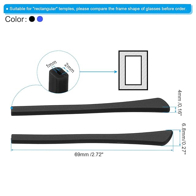 カラー: ブラック、ブルー; 材料: シリコーンゴム; 穴サイズ: 1 x 2 mm; サイズ: 69 mm x 6.8 x 4 mm (L*W*H); パッキングリスト: 5ペア x メガネテンプルチップ