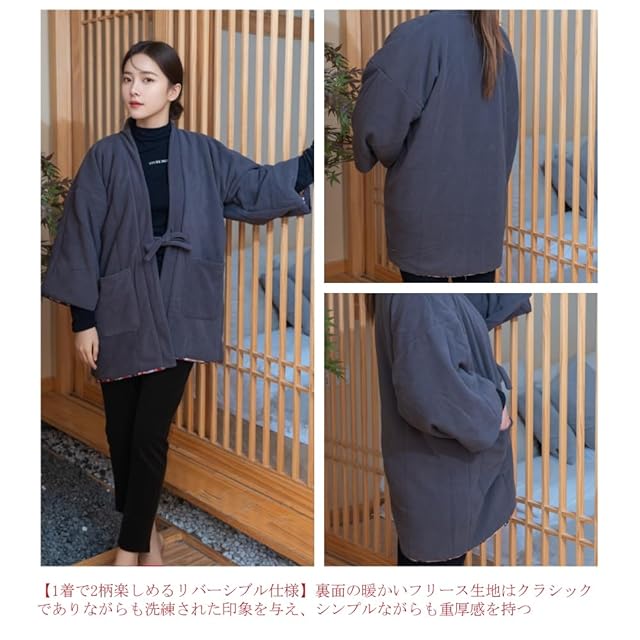 [HOHO AYUMU] 発熱綿入り リバーシブル フリース はんてん 【03柄】【レディースL】