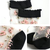 【靴下レディース花柄透明ソックス】:夏の季節にいろいろな花が次から次へ咲き、どこでも活気があふれています。こんな時、季節に合わせた靴下 レディースシースルーソックスが履くと、季節の楽を楽しむことができます。白の生地に異なる花模様が付き、ファッションに溢れる、魅力的なおしゃれ夏用ソックスレディースです。