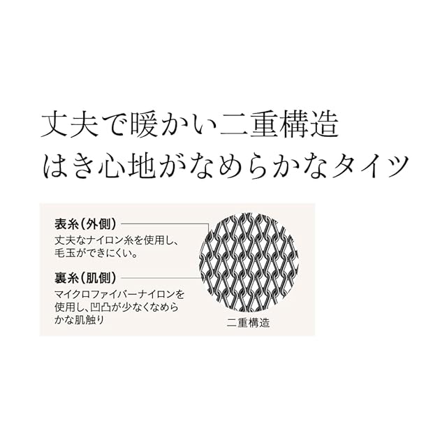 【丈夫で暖かい二重構造】丈夫さと肌側の触感にこだわった新設計。肌側はマイクロファイバーナイロンでなめらかな肌触り。表側は丈夫なナイロンで破れにくく毛玉ができにくい。