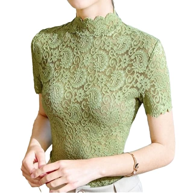 [KOEKOI] シアー トップス ハイネック tシャツ レディース 半袖 カットソー タートルネックシースルー レース 大きいサイズ 重ね着 uvカット付け襟 タートルネックトップス 無地 伸縮性 カジュアル 薄手 五分袖 透け感 シャツ uvカットインナー ブラウス (M, 緑) | AVENIR
