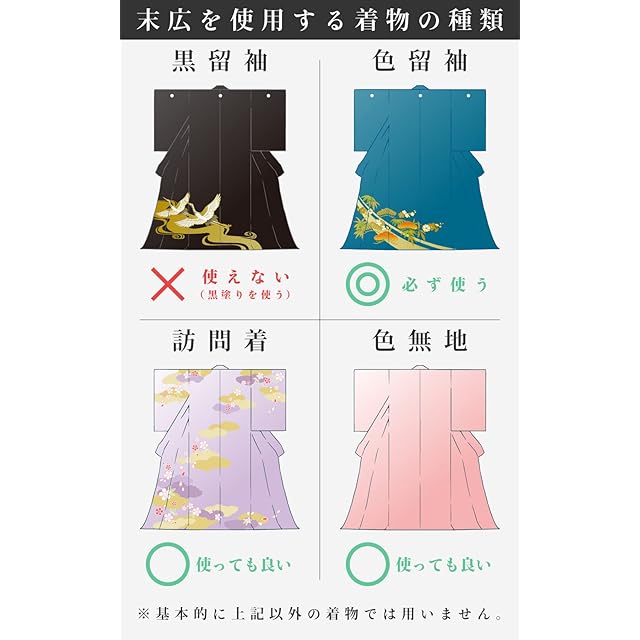 末広を広げてあおいだりする行為はマナー違反とされています。基本的には常に閉じた状態で使用します。また、タメ塗りの末広は黒留袖にはお使いいただけません。色留袖・訪問着・色無地のお着物をお召しの際にご使用ください。