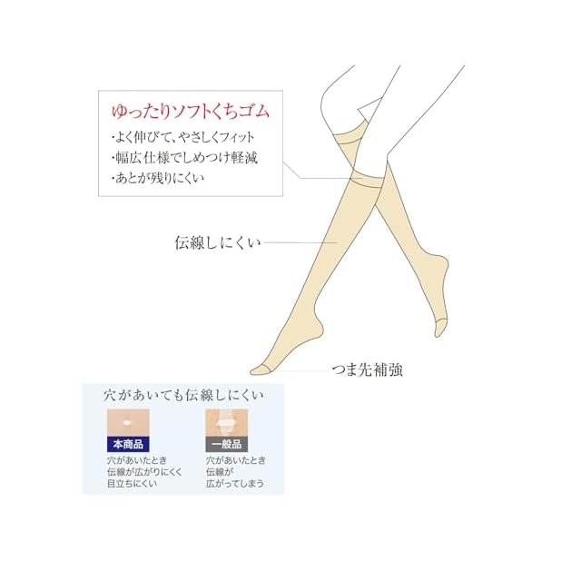 【伝線しにくい】穴があいても伝線しにくい特殊技術を採用。糸と糸を熱で融着しているので、伝線が広がりにくく穴があいても目立ちにくい。こだわりの丈夫な仕様で長くご使用いただけます。