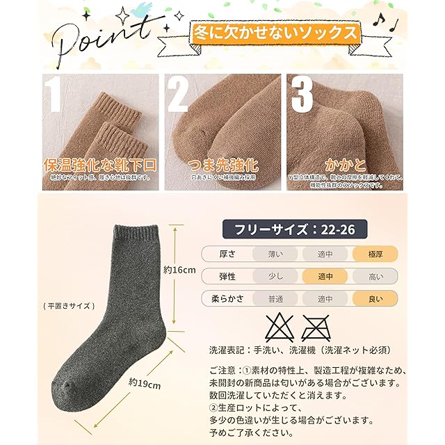 【足に優しいレディース ソックス】靴下の履き口からつま先まで全部ふわふわとして、まるで暖かい雲に包まれているようです。アジア人間工学に基つく靴下は足の形状に合わせて確り縫製されレディース 冬 ソックス。ソックスのつま先の縫製技術も些細に、つま先にキツく感がなく、柔らかで快適な使用心地を実現!足首や踵など摩擦が激しいところでも破れることはなく、長い間のご愛用頂け靴下 レディース 冬 ソックスです。