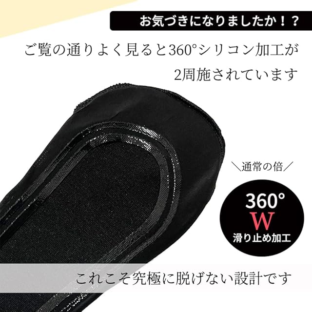 フットカバーに求められる脱げにくさを徹底追及された 究極に脱げない設計フットカバー 360度全てに滑り止めシリコンが施されたフットカバー 1周ではなく2周ダブルで滑り止めを施すことで 徹底的な脱げにくさを実現! 全面のダブル滑り止め加工が日常のあらゆる足の動きに対応! どんなシーンでも脱げにくい 一度履いたらピタっと密着します 様々なコーデにマッチする浅履きタイプ 底面のみ綿を使用しムレにくいのもポイント! 快適な履き心地がずっと続きます ブラック、ベージュの2色から選べる3足セット 春~秋のデイリーユースに!