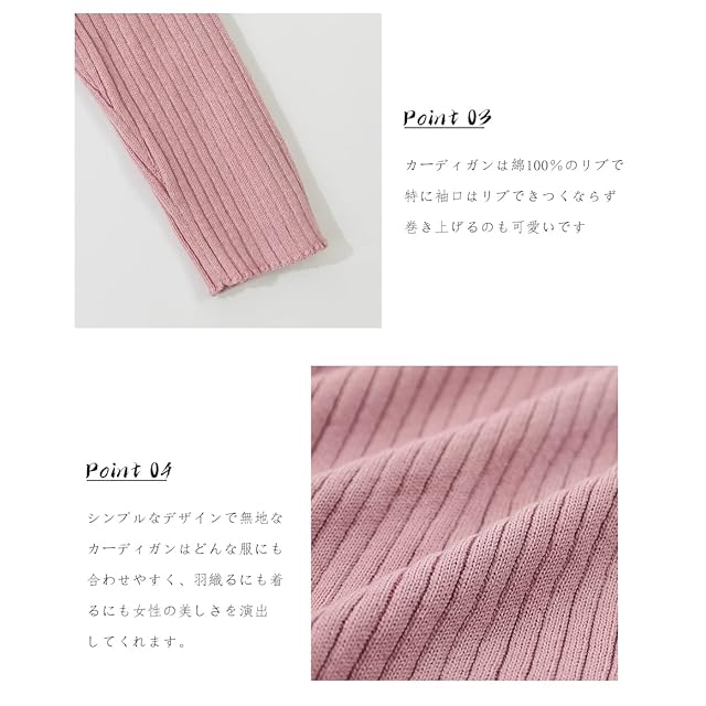 【万能なレディースカーディガン 】柔らかい肌触りで春、夏、秋に着られるコスパ最高なカーディガンです。リブ素材とメリヤス編みが薄手で、ちょうどいい厚さで冷房対策におすすめの快適なレディースカーディガンです。ボタンを全部閉めるとトップスとしてもお使い頂けます。年齢や対象を問わずに幅広い方に選ばれています。 定番なグレーとピンク、ベージュの3色の2サイズ展開、リブ素材の厚手とメリヤス編みの薄手をご用意し、ニーズに応じて楽しく選べるカーディガンです。普段着はもちろん、職場用、通勤や通学、レジャータイム、ちょっとしたお出かけ、ドライブや旅行、 食事会、イベント、など様々なシーンで活躍します。軽くて持ち運び便利、ⅴネックのデザインで、首と鎖骨のラインがスッキリと見えて女子の魅力をアップします。シンプルな無地デザインがどんな服にも合わせやすくて、女性の美しさを引き立ててくれるカーディガンです。