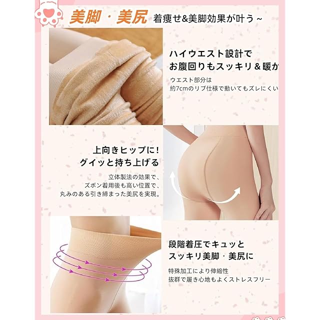 【着痩せた効果抜群】弊社の防寒タイツは立体圧縮構造を採用しており、優美な脚型を形作ることができ、生脚よりも細く見える効果があります。ウエストは適度な過度な着圧設計で、お腹の脂肪に対応すると同時にヒップを持ち上げます。伸縮性のある生地には特殊加工を施し、長時間着用しても締め付け感がありません。ボディを美しくシェイプしながら、抜群の着心地を楽しめます。
