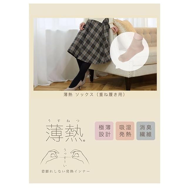 薄熱 ソックス は、汗を吸って発熱する吸湿発熱素材「エクス」を使用した先丸タイプのインナーソックスです。<br> 素足のままのような極薄で、ムレ感のないドライで快適な着用感です。<br><br> ●重ね履きに最適な薄さ<br> 靴下やタイツ、ストッキングの下にも重ね履きできる超薄手のインナーソックスです。<br> 伸びのよいストレッチ素材により密着性が高くズレにくく、重ね履きに最適です。<br><br> ●吸湿発熱機能糸エクス<br> 汗を吸って発熱・放湿をし、繊維自体が発熱して身体を温める吸湿発熱素材です。<br> 湿気を取り込む吸湿力が高い繊維で、ムレないドライな温かさが魅力の消臭機能付き素材です。<br><br> ●冬場にうれしい消臭効果<br> 体臭の原因であるアンモニアや酸性臭を中和して消臭します。<br> 臭いのこもりにくい綿よりも強力に臭いを取り除きます。