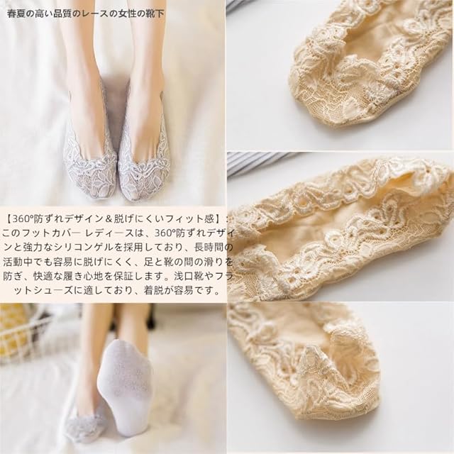 【高級素材構成&レースデザイン】:このフットカバー レディースは、綿とシルクの混紡素材を採用し、柔らかく快適な触り心地と上品な外観を提供します。足の長さ約22~25cmに適しています。精巧なレースデザインが女性の魅力をアップさせ、このフットカバーはファッション性と機能性を兼ね備えています。