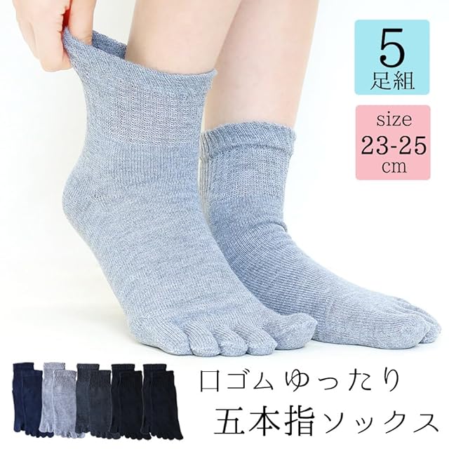 [box408] 5本指 靴下 レディース 5足セット 口ゴムゆったり 五本指 ソックス ベーシックデザイン 無地 ブラック ネイビー チャコール グレー 綿混 シンプル 23-25cm | AVENIR