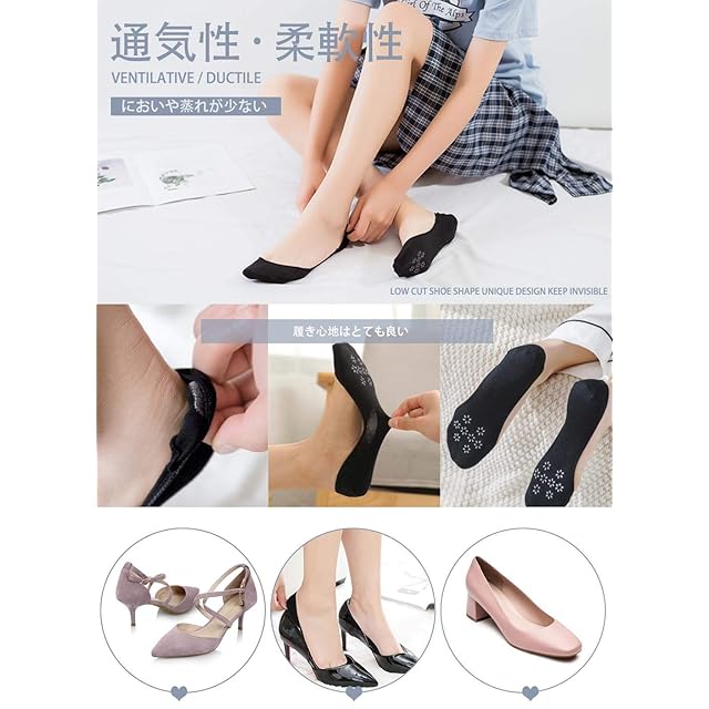 1.シルク浅履きフットカバー:靴の外から全く見えません。お洒落の邪魔をしません。これを履くと、両足が全然蒸れません。極薄デザインですから。履き口の内側の360°と足底にシリコン滑り止め付き、履きやすくて脱げないパンプスソックスです。