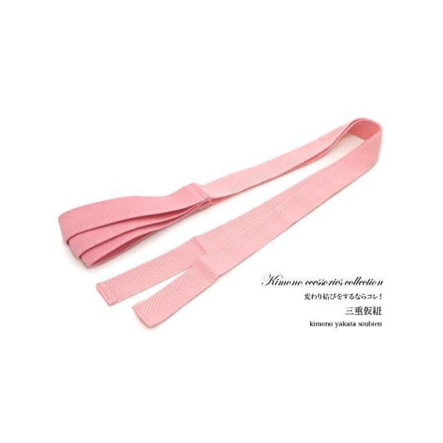 盛装での変わり結びの必需品である三重仮紐。<br>振袖や、七五三の帯結びにとても重宝する便利な小物です。<br>真ん中に3層になったゴムのついた紐で、この層の間に帯を挟み込むことで美しい変わり結びの形をキープできる便利小物です。<br>プロの着付師が開発したアイデア商品で、現在ではすっかりおなじみになったアイテムです。<br>美しい変わり結びを長時間着崩れする事無くキープする事が出来ますので成人式や結婚式、七五三などの晴れの日に大活躍する着付け小物です。<br>また、帯の痛みを軽減する事が出来るメリットもございます。<br>出来上がった後姿に差が出ますので是非ご活用ください。