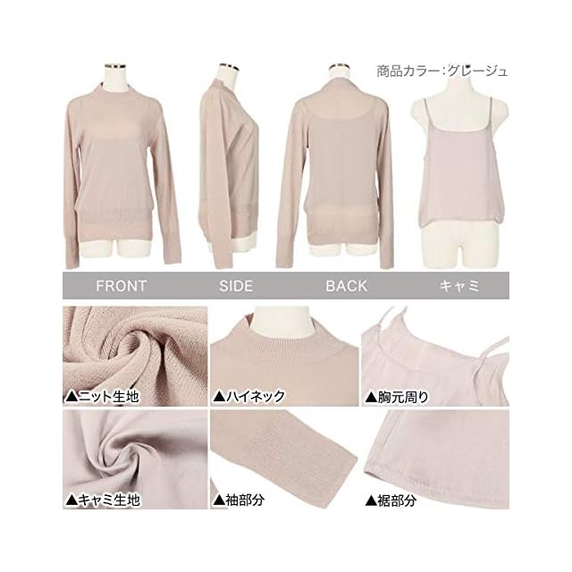 サイズ ニット、着丈 59、肩幅 36、身幅 46、裾幅 30、袖丈 61、袖幅 17、袖口幅 7.5サイズ キャミ、着丈 48、身幅 48、裾幅 50
