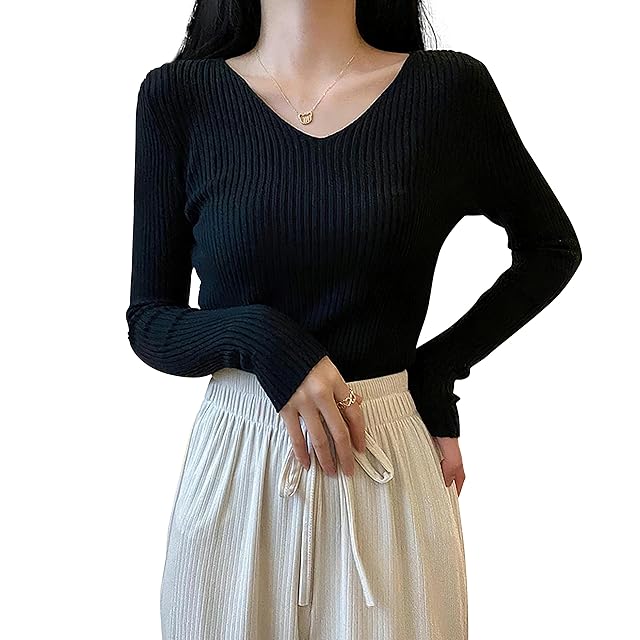 [PALAME] リブニット レディース Vネック セーター ニュートライ浅Vネック・大人め高級魅力・鎖骨美人・重ね着・高伸縮・リブ素材・着回し力・華奢見え・薄手 ニットソー カットソー トップス ニット 長袖 リブ 秋 冬 ストレッチ (ブラック) | AVENIR