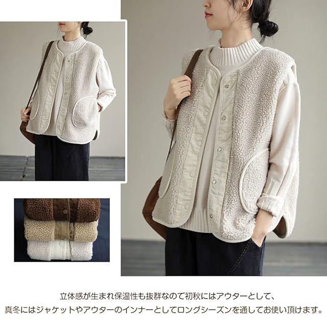 ★ フリースとコーディロイの切り替えモコモコベストはショートパンツミニスカートブーツなどにコーディネートして素敵なシルエットが出てきます。ハイネックセーターやゆるニットなどと相性良く合わせられ、厚手のトップスでも広めのアームホールで重ね着しやすいのが嬉しいポイントです。