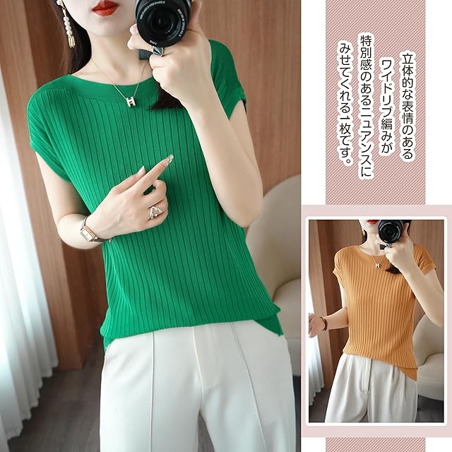 [Bolan Verl] フレンチスリーブ サマーニット カットソー 薄手 レディース 半袖 リブ ニット トップス ボートネック 春服 夏服 ゆったり 細見え アーミーグリーン L | AVENIR