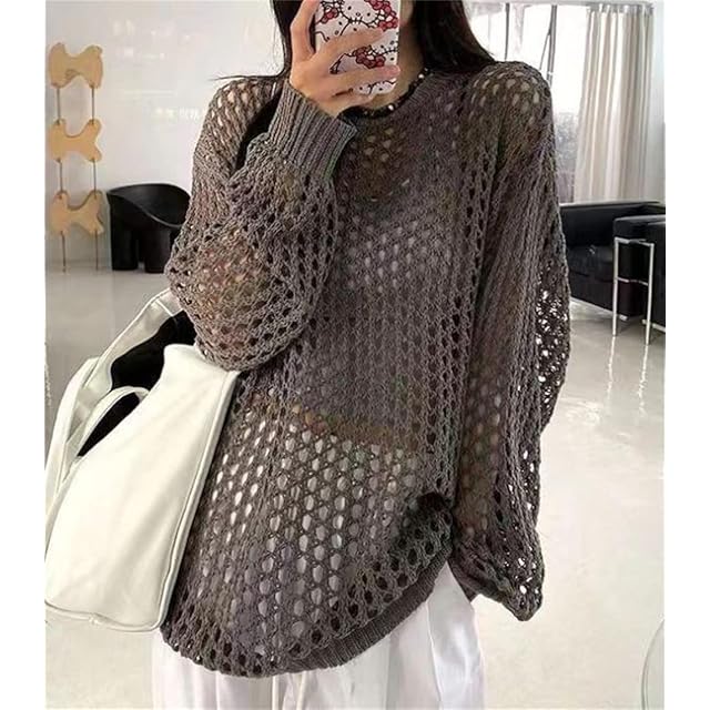 [ZXCVWWE] レディース ニットセーター 透かし編み ゆったり サマーニット プルオーバー オーバーサイズ セーター ロング丈 クルーネック トップス 体型カバー 重ね着 UV対策 冷房対策 カジュアル 通勤 通学 (F, グレー) | AVENIR