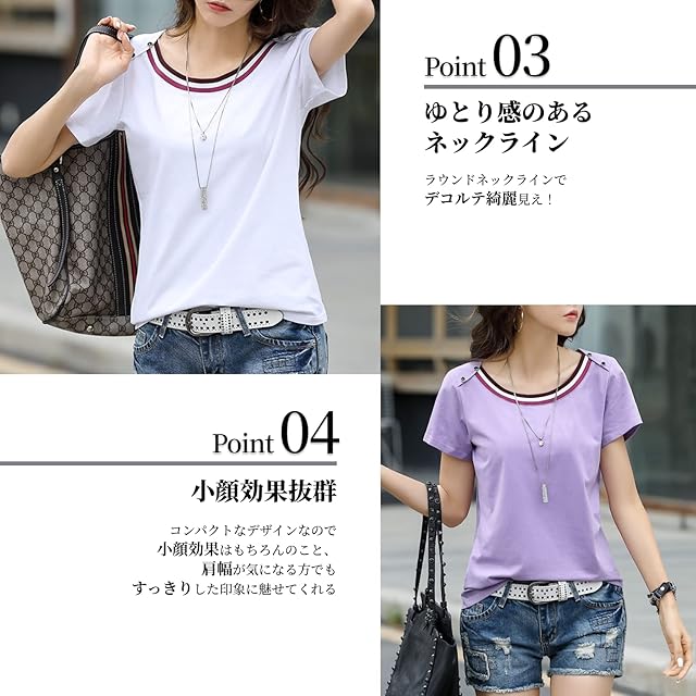 ✅【トリコロールカラーのオシャレなtシャツ】 首周りのトリコロールデザインがアクセントの、シンプルなレディースtシャツが登場です。首元以外の場所にはロゴなどもありませんので、すっきりと着こなしていただくことができます。トリコロールカラーと肩のボタンが目線を引き付けてくれるので、アクセサリーは必要最小限でもコーデが簡単にきまります。またラウンドのネックラインはデコルテをきれいに魅せてくれるデザインになっていますので、小顔効果はもちろんのこと、肩幅が気になる方でもスッキリとした印象に魅せてくれるのもポイントが高いです。