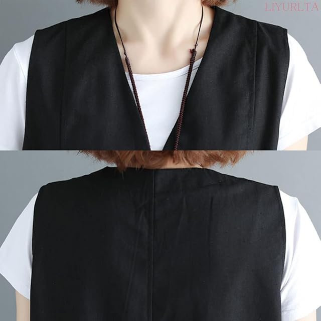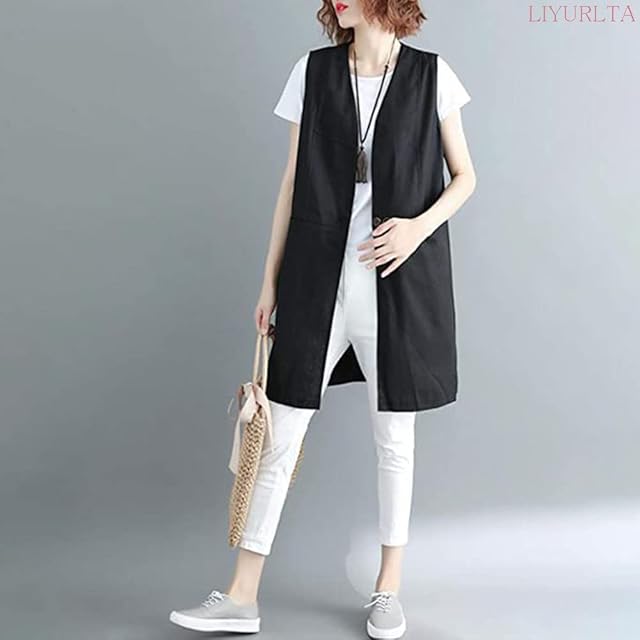 LIYURLTA ベスト レディース 綿麻 ノースリーブ ロングベスト カジュアル おしゃれ 通勤 薄手 無地 大きいサイズ 春夏秋 LIY18 (XL, ブラック)