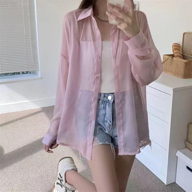 [Xingsas] シアーシャツ 透け感 レディース日焼け止め 上着 日焼け止め シャツ 透けシャツ 長袖上着 シャツ 前開きシャツ 重ね着 大きいサイズ トレンド 白 カジュアルファッション ゆったり涼しい 夏 春 秋 ライトブルー (pink) | AVENIR