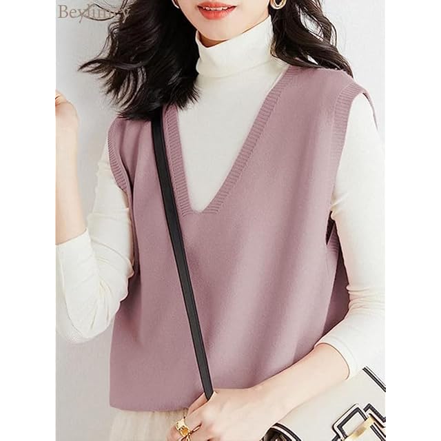 Beylimcy ニット ベスト レディース Vネック セーター リブ 体型カバー おしゃれ エレガント 着回し カットソー 着痩せ カジュアル 通勤 トップス 春 秋 冬 Bey37 (M, ピンク) | AVENIR