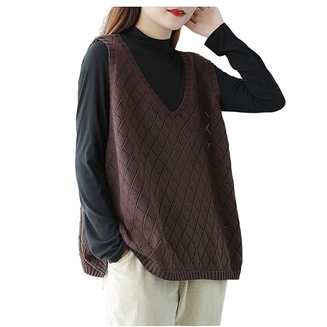 [KOEKOI] ニットベスト レディース ベスト 刺繡トップス カジュアル 着瘦せ 無地 透かし レトロ 編み風 大きいサイズ 重ね着風 レディース トップス ニット セーター おしゃれ 花柄 ベストきれいめニット (Free, 深茶-丸首) | AVENIR