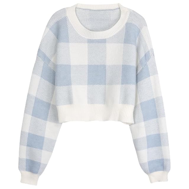 [UQQA] ショート丈 ニット トップス レディース セーター ブロックチェック ゆったり トレーナー 秋物 レディーストップス 長袖 ビッグシルエット ゆるふわ 春のトップス 大きめ チェック 春ニット ボリューム セーター 着回し 大人可愛い お散歩コーデ コーデ かわいい レディース大きいサイズ ストリートファッション ラウンドネック カジュアルコーデ 部屋着 ブルー | AVENIR