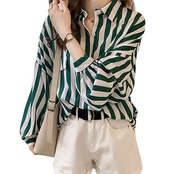 [ブランクブラン] ストライプ 長袖 シャツ ブラウス 柄 ビジネス ゆったり デザインブラウス かわいい レトロ 可愛い おしゃれ クール オシャレ カッコいい m サイズ 薄手 透けない 結婚式 カジュアル ファッション ストリート ナイトウェア パジャマ 私服 普段着 出張 高校生 学生 ガールズ 中学生 社会人 フェイクポケット 羽織り 縦縞 トップス 緑 グリーン 3A-B02-GRM | AVENIR