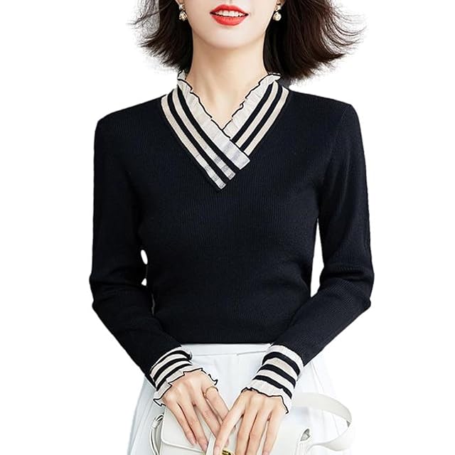 [J-Scott] 【在庫限り】袖衿フリルリブニット シアーフリル 異素材MIX Vネック スリムフィット 長袖 美ライン 上衣 レディースライク 切替え きれいめニット シアー 高見え ロング袖 セミタイト 10部袖 異素材切替 コーディネート ボリュームハイネック リブ オシャレ着 ネック 甘可愛い ストレッチ おとな ボディライン 秋セーター ハイネック ブラック JS98-BK-M | AVENIR
